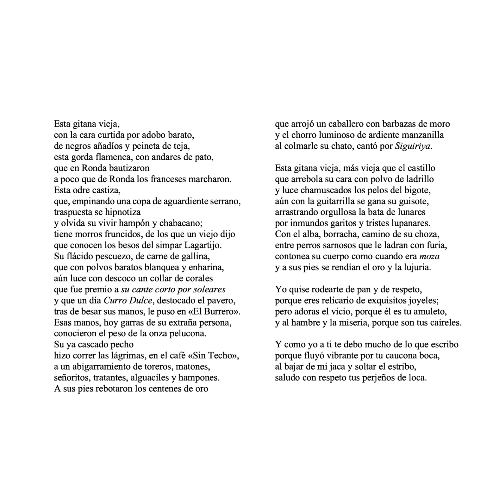 "Quiero recordar a Romerillo, al espiritual loco Mateo, a Antonia la de San Rque, a Anita la de Ronda, a Dolores la Parrala y a Juan Breva, que cantaron como nadie las Soleares"